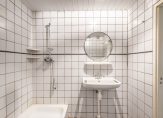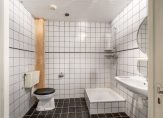 Eenvoudige badkamer circa 4,5 m² voorzien van een douche, toilet, wastafel en opstelplaats wasmachine.