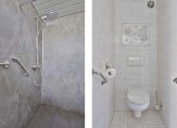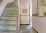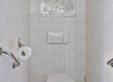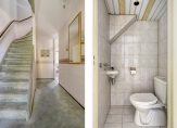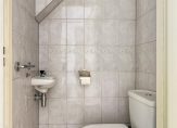 Overloop voorzien van keurig separaat toilet met hangend closet, betegeld tot het plafond en luchtafvoer. Trap naar de tweede verdieping.