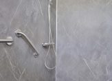 Keurige badkamer circa 5 m² voorzien van een inloopdouche, wastafelmeubel met spiegel en hoge kast, radiator, een raam voor natuurlijke ventilatie en betegeld tot het plafond.