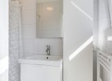 – Geheel betegelde badkamer met inloopdouche, wastafelmeubel, designradiator en raampje voor natuurlijke ventilatie;