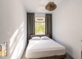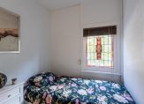 Slaapkamer 1 aan de voorzijde circa 11 m² voorzien van houtlook laminaatvloer met hoge plinten en glas in lood bovenraam.