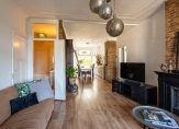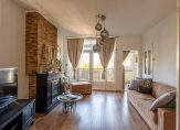 Woonkamer aan de voorzijde met erker voorzien van glas in loodramen in dubbel glas en eetkamer aan de achterzijde voorzien van dubbele openslaande deuren, circa 32 m² voorzien van houtlook laminaatvloer met hoge plinten en origineel stucwerk plafond.