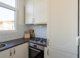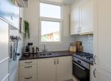 Moderne keuken aan de achterzijde circa 5 m² voorzien van 4 pits gas kookplaat met afzuigkap, koel-vriescombinatie, spoelbak, opstelling cv-combiketel en kunststof kozijnen met dubbel glas.