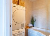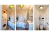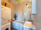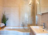 Moderne badkamer circa 4 m² voorzien van ligbad met veiligheidsglazen douchescherm en stortdouche, wastafelmeubel met spiegelkast, design radiator, opstelplaats wasmachine/wasdroger, betegeld tot het plafond en mechanische afzuiging.