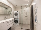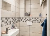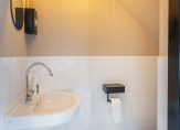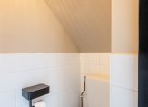 De riante badkamer is geheel betegelde en voorzien van een fijne inloopdouche met easydrain en regendouche, groot wastafelmeubel met spiegelkast, inbouwspots, designradiator en de aansluitingen van zowel de wasmachine als droger zijn hier aanwezig. Seperaat is de hal is een geheel betegelde toiletruimte aanwezig, voorzien van een hangend closet en fontein.