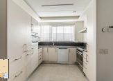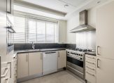 De U-vormige keukenopstelling is aan de voorzijde van de woning gelegen en beschikt over een 5-pits gaskookplaat met afzuiging, koelkast, vriezer, vaatwasser en oven.
