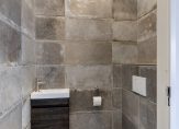 In de gang is, in dezelfde kleurstijl, de toiletruimte geheel betegeld en voorzien van een hangend closet en fontein.