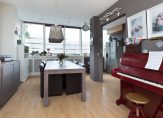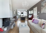 De riante doorzonwoonkamer heeft een diepte van ruim 10 meter en beschikt door de grote hoeveelheid raampartijen over een grote hoeveelheid natuurlijk lichtinval. De gehele ruimte is voorzien van een keurige wand- en vloerafwerking, hard houten kozijnen met dubbel glas en een sfeervolle open haard.
