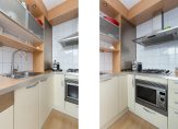 Aan de achterzijde van de woning is de L-vormige open keukenopstelling gelegen, welke is voorzien van een 4-pits kookplaat, anderhalve spoelbak, vaatwasser, losse koelkast en oven.