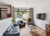Zonnige achtertuin op het zuiden van circa 11 meter diep, betegelde terrassen, zonwering en achterom;