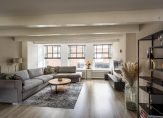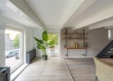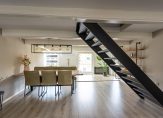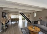 Royale woonkamer van circa 49 m² sfeervol met zichtbare vloerbalken, glas-in-lood zijraam, grote raampartijen, airco, open trap naar 2e verdieping en strak afgewerkt met een moderne hout look laminaatvloer voorzien van hoge plinten en stucwerk afwerking.