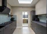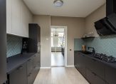 Moderne mat zwarte keuken uit 2022 circa 9 m² voorzien van 5-pits gaskookplaat met afzuigschouw, combi-oven, koel-vriescombinatie, vaatwasser. spoelbak en hoge kasten voorzien van opstelling cv-combiketel.
