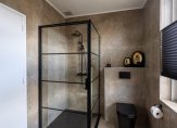 Moderne badkamer uit 2022 circa 6 m² met inloopdouche voorzien van industrieel zwart stalen wand voorzien van glas, stortdouche en easy drain regengoot, wastafelmeubel met dubbele kraan, spiegel en hoge kast, zwart hangend design toilet, design radiator, raam en natuurlijke luchtafzuiging.