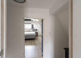 Ruime overloop met vakwerkdeuren voor toegang tot alle vertrekken. De gehele etage is afgewerkt met een moderne hout look laminaatvloer en strakke wand en vloer afwerking.