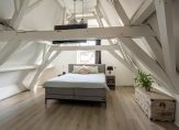 Slaapkamer 1 aan de voorzijde circa 16 m² met moderne houtlook laminaatvloer, zichtbare dakspantenconstructie en airconditioning.