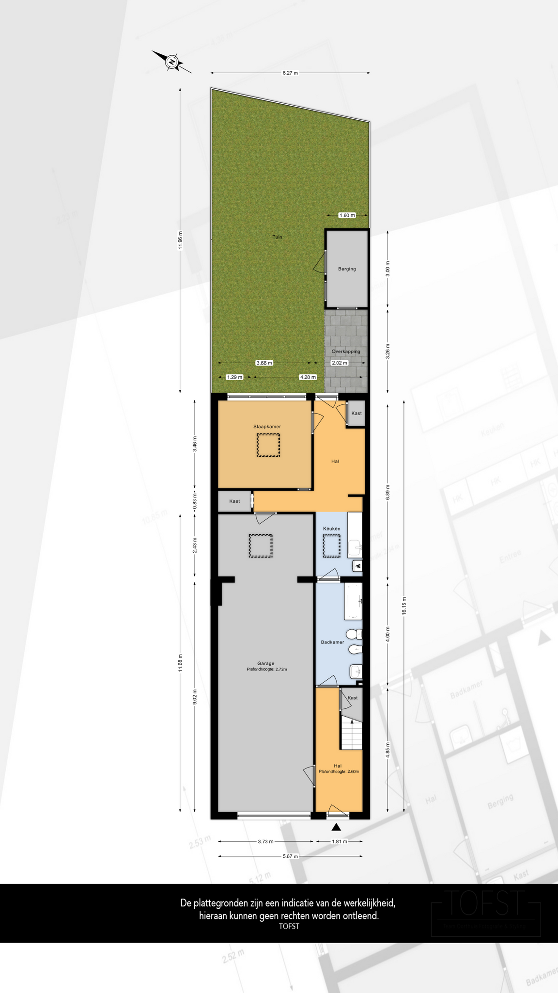 – Bijna 12 meter diepe en ruime 6 meter brede achtertuin met overkapping, berging en achterom;