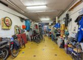 Garage, te gebruiken voor 2 auto’s, motor en/of werkplaats, circa 43 m² met schuifdeur en toegang tot de achterzijde.