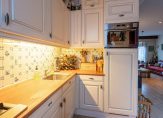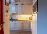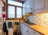 Keurige keuken, circa 6 m² voorzien van een 5 pits gas kookplaat met afzuigkap, magnetron, koelkast, geïntegreerde spoelbak en een deur met toegang tot het balkon van circa 4 m².