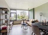 De sfeervolle woonkamer van circa 18.5 m² is gelegen aan de achterzijde en heeft een uitzicht over de tuin van de VvE en de omgeving.
