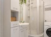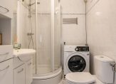 De keurige badkamer van circa 4 m² is voorzien van een douchecabine, een wastafelmeubel met spiegelkast, een toilet, opstelling van de wasmachine en is tot het plafond betegeld in lichte kleurstelling.