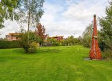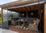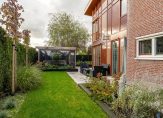 De tuingerichte woonkamer van 40 m² ontvangt dankzij de grote raampartijen veel natuurlijk licht. Deze prettige ruimte is voorzien van een eiken houten parketvloer en een sfeervolle houtkachel. Via de dubbele openslaande deuren heeft u toegang tot de zonnige achtertuin. De achter- en zijtuin beslaan gezamenlijk ongeveer 90 m² en dankzij de gunstige ligging geniet u de hele dag van de zon. De fraai aangelegde tuin biedt volop privacy door de groene, vrije omgeving en beschikt over een terras, gazon, tuinverlichting, een berging, een achterom en een heerlijke afsluitbare overkapping.