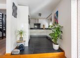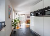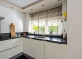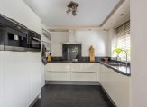 De luxe, U-vormige open keuken aan de voorzijde van de woning is voorzien van een granieten werkblad en biedt goed zicht op de zijtuin. De keuken is uitgerust met Miele en Siemens inbouwapparatuur, waaronder een inductiekookplaat met afzuigkap, stoomoven, combimagnetron, koffiemachine, vaatwasser, koelkast, vriezer en een spoelbak met kokend waterkraan. De vloer van de keuken is afgewerkt met plavuizen.