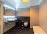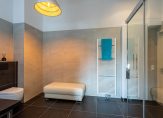 De moderne badkamer van circa 12 m² is betegeld in een eigentijdse kleurstelling en uitgerust met een ruime douchecabine met easydrain regengoot, een dubbel wastafelmeubel met verlichte spiegel, een tweede hangend toilet en een designradiator.