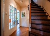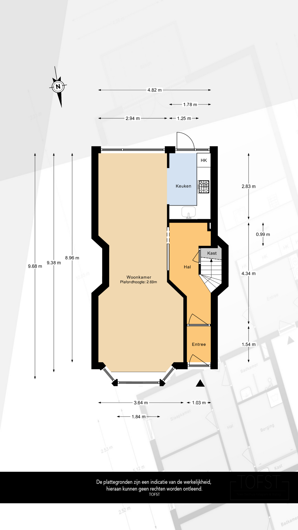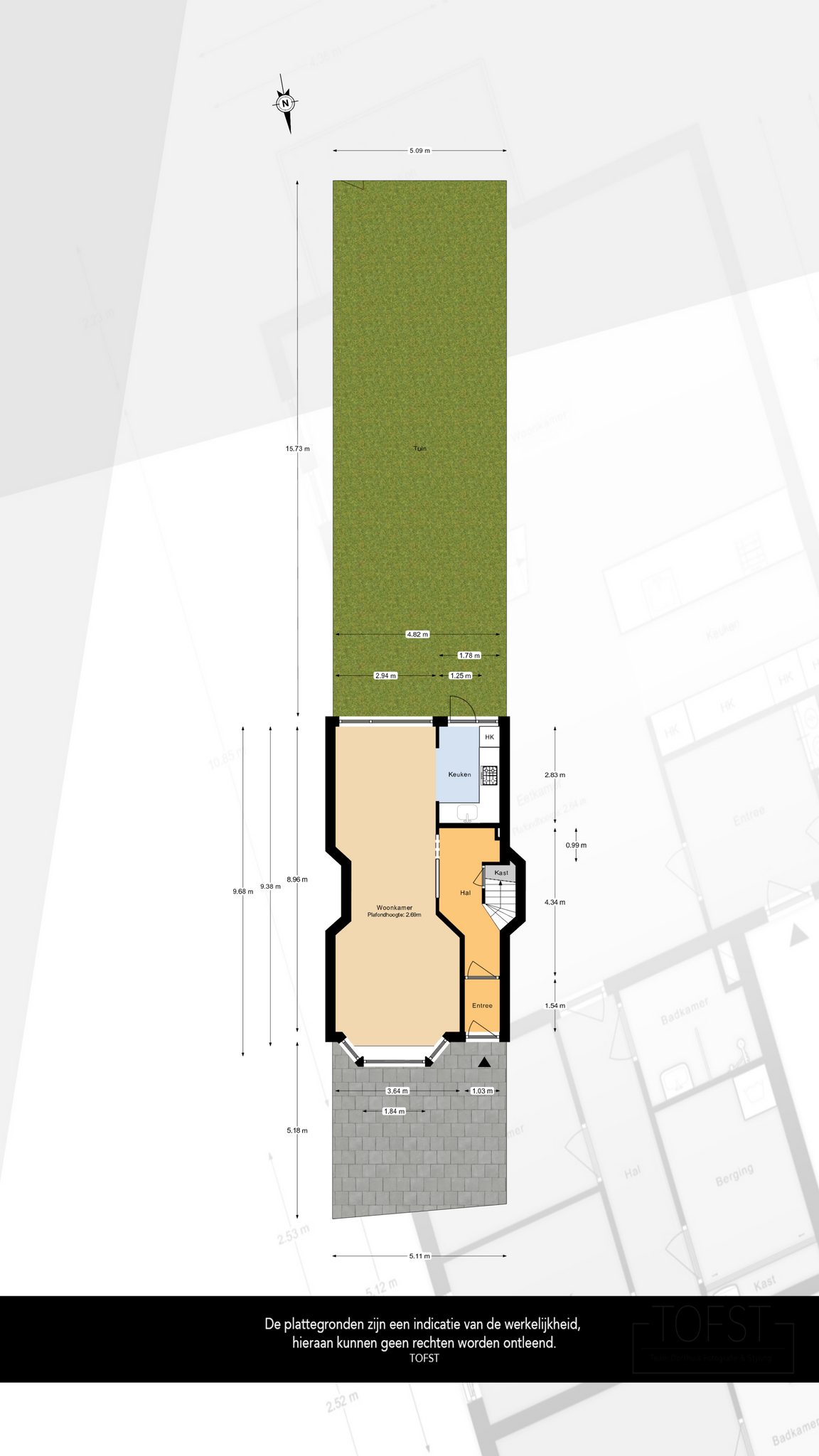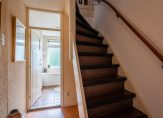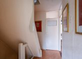 Door middel van de met groene border aangelegde voortuin komt u onder de luifel binnen in de ruime tochthal en ruime ontvangsthal. Deze is keurig afgewerkt met laminaat, trapkast, garderoberuimte met meterkast, plaats om op de originele plek het toilet terug te plaatsen en een trap naar de eerste verdieping.