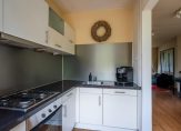 Keurig nette open keuken met composiet blad en alle hedendaagse inbouwapparatuur als een gaskookplaat met afzuigschouw, oven, koel-vriescombinatie, vaatwasser, spoelbak en een loopdeur naar de achtertuin.
