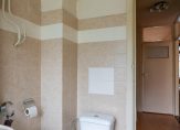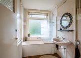 De eenvoudige badkamer van circa 4,5 m² is voorzien van een ligbad, een toilet, een wastafel, radiator en een raam voor natuurlijke ventilatie. De badkamer is goed te vergroten door het aangrenzende balkon.