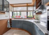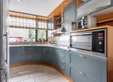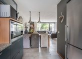 De keuken is gelegen aan de voorzijde van de woning, heeft een ronde hoekopstelling en is voorzien van een keramische kookplaat, afzuigkap, vaatwasser en oven.