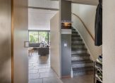 Via de voortuin vindt je de entree die toegang biedt tot de hal. De ontvangsthal van de woning is voorzien van een geheel betegelde toiletruimte met hangend closet en fontein (2024), meterkast, trap naar de verdiepingen en verstrekt u de toegang tot de woonkamer.
