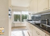 De dichte keuken is voorzien van een recht keukenblok in lichte kleurstelling en beschikt over een koelkast, combimagnetron, vaatwasser, gaskookplaat en afzuigkap. Vanuit de keuken er is toegang tot het tweede balkon met een vaste kast en eveneens een mooi vrij uitzicht.