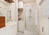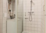 De badkamer is ruim opgezet. volledig betegeld en beschikt over een douchecabine, wastafelmeubel, wasmachine en de opstelling van de elektrische boiler.