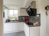 Moderne witte open keuken, circa 5 m², met beton look blad en alle hedendaagse keuken apparatuur als een inductie kookplaat met afzuigschouw, combi magnetron, koelkast, vaatwasser en spoelbak met kokend waterkraan RVS Quooker en loopdeur voor toegang tot de achtertuin.