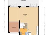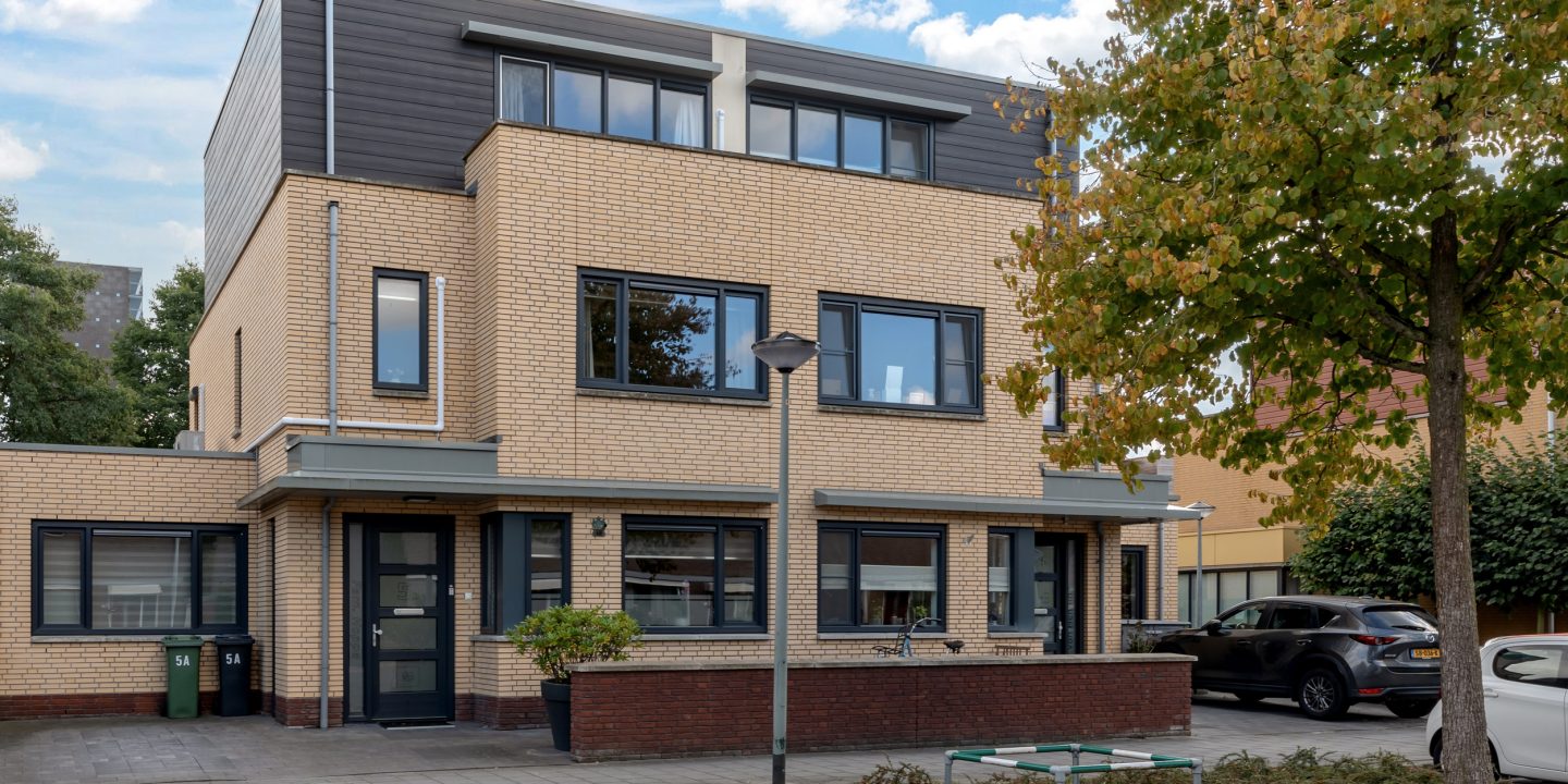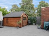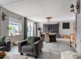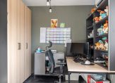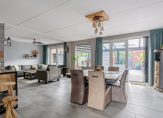 De achtertuin heeft een grote woningbrede veranda met ingebouwde screens, fraaie betegeling en achterin de tuin een houten berging en extra houten chalet voor voldoende bergruimte. Via de achterom kom je op een groen grasveld, een fijne plek voor kinderen om te spelen. Op de begane grond bevindt zich de eerste (slaap)kamer, ook ideaal te gebruiken als praktijk- of kantoorruimte aan huis.