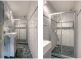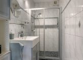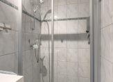 – Keurig nette badkamer met een douchecabine en een wastafelmeubel;
