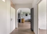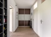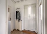 Entree woning, ruime ontvangsthal voorzien van meterkast, garderoberuimte en een toilet met hangend closet betegeld tot het plafond en wasbakje.