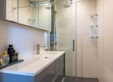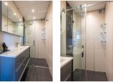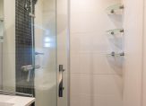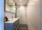 De moderne badkamer is geheel betegeld en voorzien van een riante inloopdouche met regendouche en een wastafelmeubel.