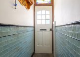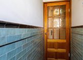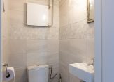 Tussenhal met fraaie toiletruimte voorzien van toilet met hand wasbakje, radiator en betegeld tot het plafond.