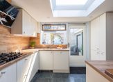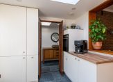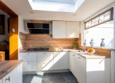 De moderne open keuken van circa 8 m² uit 2018 is voorzien van lichte fronten met een houtlook blad en compleet met alle hedendaagse keukenapparatuur als gas kookplaat afzuigschouw, oven, koelkast, vriezer, vaatwasser, apothekerskast en een spoelbak. Verder een daklicht voor veel lichtinval om in een fijne ruimte een goed diner voor te bereiden.