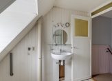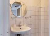 Keurig en ruim toilet voorzien van wastafel, gedeeltelijk betegeld en voorzien van luchtafvoer.