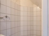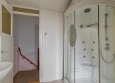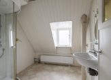 Badkamer circa 5 m² met douchecabine, wastafel met spiegel, opstelling wasmachine en dakkapel.