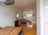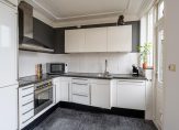 Bij binnenkomst op de begane grond loopt u de trap op naar de eerste verdieping en komt u uit in de royale woonkamer met fraaie parketvloer en aan de voorzijde een karakteristieke erker. De moderne witte open keuken ligt aan de achterzijde, waar ook voldoende plek is voor een grote eettafel. Via de keuken is er toegang tot het dakterras.
