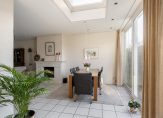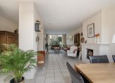 Heerlijk ruime woonkamer van circa 48 m² met plavuizenvloer voorzien van vloerverwarming en inbouwplafondspots. Aan de voorzijde de zijbeuk met zijraam en aan de achterzijde de uitgebouwde eetkamer met sfeervolle open haard, dakramen voor veel lichtinval en schuifpui naar de achtertuin.
