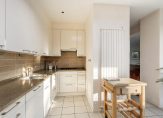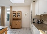 Keurige keuken van circa 12 m² voorzien van een granieten aanrechtblad met gaskookplaat, afzuigschouw, oven, magnetron, koel-vriescombinatie, vaatwasser, spoelbak met elektrische boiler en een plavuizenvloer met vloerverwarming. Loopdeur naar de achtertuin.