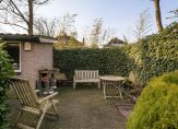 Royale en groene achtertuin van circa 20 meter diep op het zonnige westen, met terras voorzien van zonwering en een achtergelegen terras.