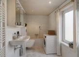 Ruime badkamer van circa 6 m² voorzien van een douchecabine, ligbad, tweede toilet, wastafel met spiegel, opstelling voor wasmachine (ook mogelijk op de tweede verdieping), designradiator en raam.
