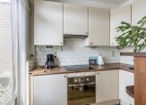 Open keuken circa 4 m² voorzien van een inductie kookplaat met afzuigkap, oven, spoelbak en toegang tot de achtertuin.