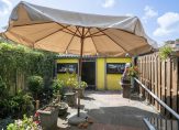 Zonnige en onderhoudsarme achtertuin van bijna 10 meter diep, op het zonnige westen, circa 49 m² voorzien van een vrijstaande stenen berging circa 12 m² met elektra en achterom.